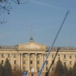 Сегодня утром к зданию Николаевского городского совета приехал высотный кран, чтобы срезать советскую звезду, возвышающуюся на крыше горисполкома. Фото с