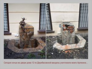Минувшей ночью во дворе старого Пассажа (Гостиницы Фраполли) прямо в центре Дерибасовской был уничтожен памятник Арлекину.
