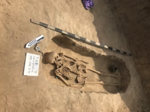 В перший же день його роботи, в другій траншеї археологи виявили пляму, що свідчила про неоднорідність ґрунту, яка вказує на те, що, ймовірно, під нею знаходиться стародавній поховальний комплекс. Бульдозер з траншеї прибрали, і за роботу взялися археологи – потрошки заглиблюючись, а потім – акуратно зачищуючи поховання для його опису і дослідження.