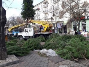 Одесситы в соцсети Facebook возмущаются вырубкой «сотен деревьев», из которых традиционно составляют новогоднюю елку на главной улице города – Дерибасовской. Так, свое недовольство выразил Анатолий Чумаков, который сфотографировал процесс установки новогодней красавицы.