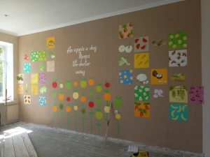 “Практично добігає до свого завершення декорування стін їдальні Антонівської ЗОШ 18! Залишилося лише написами на стінах навколо повара побажати “Смачного” різними мовами, повісити поряд дошку, де буде крейдою висвітлюватися щоденне меню для дітей, а діти, звісно, будуть писати різні зворотні побажання щодо харчування поварам та один одному! Любі друзі, закликаємо: споживайте лише здорову та корисну їжу в своєму раціоні, а ми всі сподіваємося, що яскраві картинки на стінах будуть постійно нагадувати учням і вчителям, що фруктово-овочевий ансамбль, виконує найважливішу “мелодію” для нашого організму!)