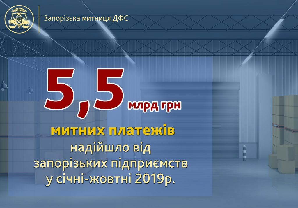 У Запорізькому регіоні за січень-жовтень 2019 року до бюджету надійшло 5 мільярдів 529 мільйонів гривень митних платежів. Зокрема, у жовтні суб’єкти господарювання перерахували до скарбниці майже 469 мільйонів.