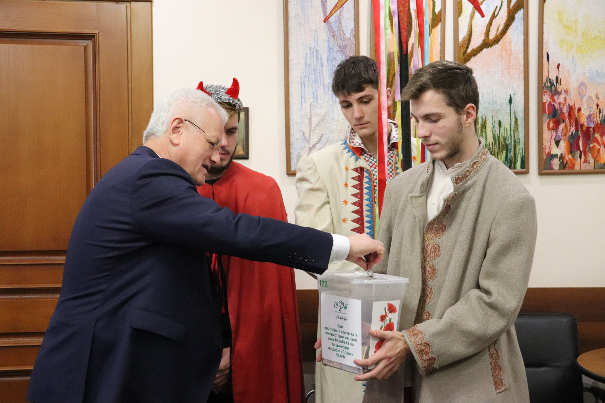 Насамперед доброчинники завітали до ректора ХДУ Олександра Співаковського, який залюбки долучився до благодійної акції. «Тисячі добрих вчинків можуть змінити світ на краще», – підкреслив ректор. І додав: «Нам є чим пишатися, адже наша молодь ініціативна, шанує українські звичаї і традиції та примножує добро».