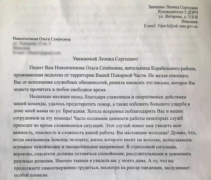 Подяку рятувальникам 5 ДПРЧ ГУ ДСНС України у Миколаївській області надіслали вдячні мешканці Корабельного району. Зі словами вдячності до рятувальників звернулася Ольга Нівенченкова. Завдяки налагодженим і оперативним діям пожежникам вдалося запобігти виникненню пожежі в будинку її матері.