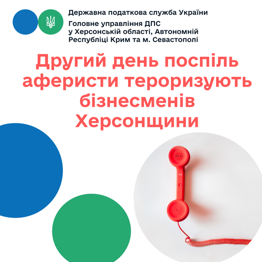 Головне управління ДПС у Херсонській області, Автономній Республіці Крим та м. Севастополі наголошує, що податківці ніколи не телефонують суб’єктам господарювання з таких питань. Будьте уважними, ні в якому разі не піддавайтесь на провокації аферистів. У разі отримання схожих пропозицій, звертайтесь на Антикорупційний сервіс ДПС України «Пульс» за тел. 0 800 501 007 та до Національної поліції за телефоном 102.