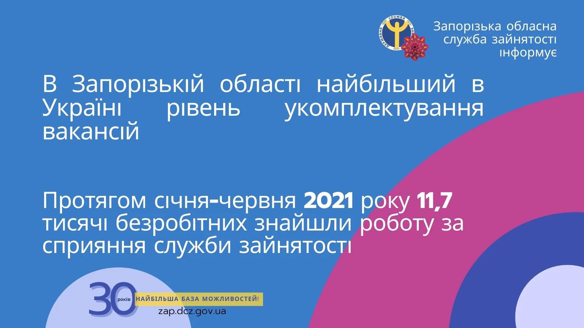 Кількість вакансій у базі даних державної служби зайнятості Запорізької області на 1 липня 2021 року становила 1937 одиниць. Найпопулярнішими професіями, на які нині існує попит, є професії кваліфікованих робітників – продавці, водії, кухарі, електромонтери, медсестри, електрогазозварники, токарі, офіціанти, слюсарі, охоронники та інші представники робочих професій. Роботодавці також шукають бухгалтерів та менеджерів з відповідним досвідом роботи.