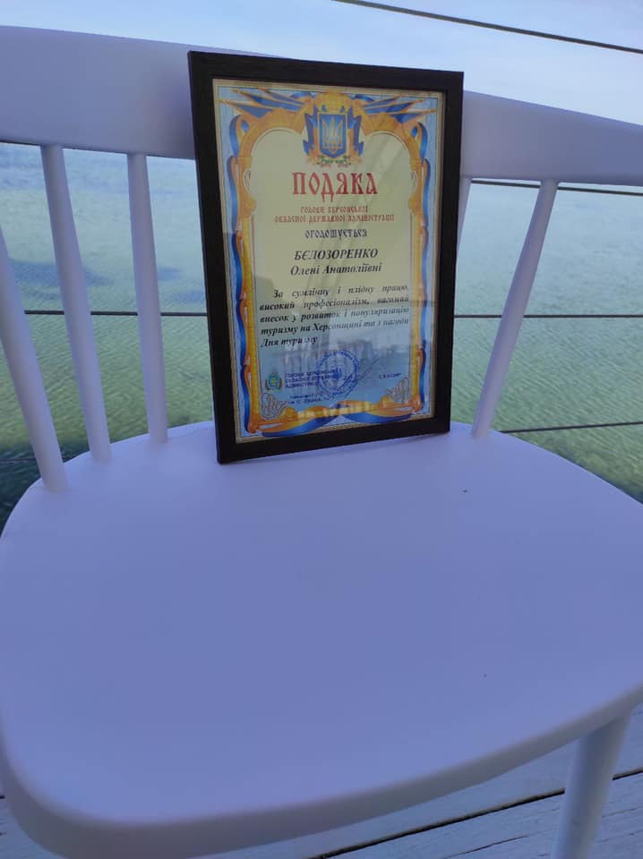 Наша ґадзиня Олена Елена Белозоренко , до дня туризму, була нагородженна подякою за сумлінну і плідну працю, високий професіоналізм, вагомий внесок у розвиток і популяризацію туризму на Херсонщині!