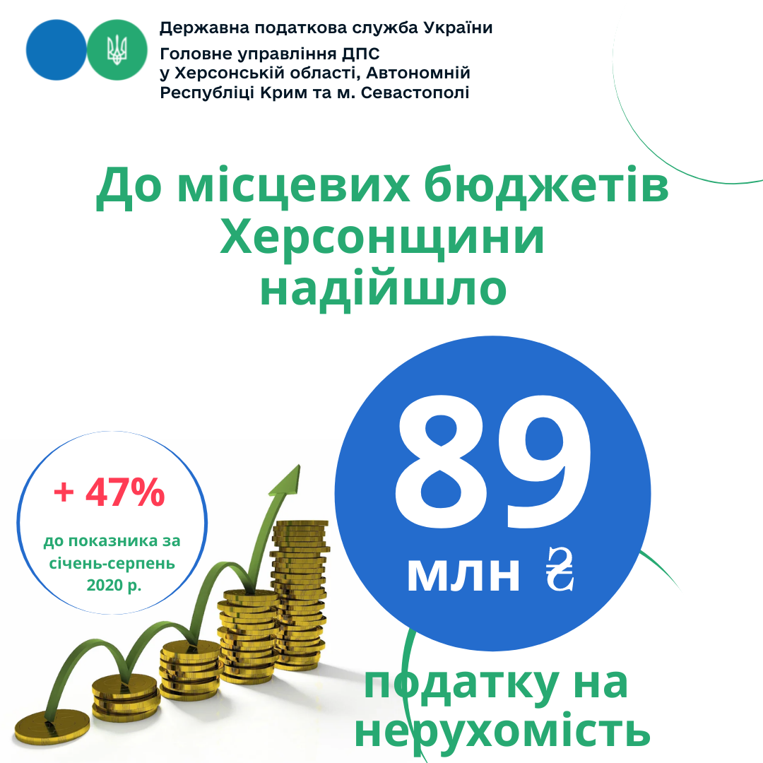 За січень – серпень 2021 року до місцевого бюджету Херсонщини надійшло 89 млн гривень податку на нерухоме майно, відмінне від земельної ділянки. Це на 28,5 млн гривень або 47% більше, ніж в аналогічному періоді попереднього року. Про це повідомили у відділі координації та моніторингу доходів бюджету Головного управління ДПС у Херсонській області, Автономній Республіці Крим та м. Севастополі.