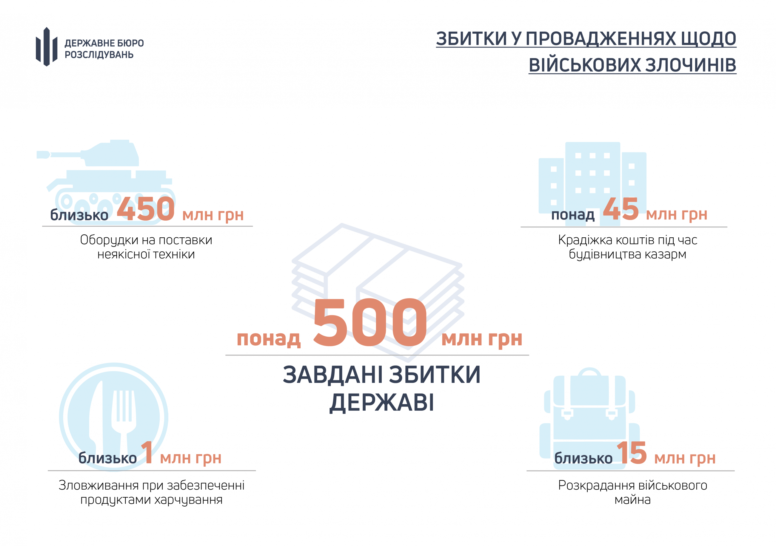 Але ця сума буде набагато більшою, оскільки до кінця 2021 року ДБР планує направити до суду ще ряд кримінальних проваджень щодо військових злочинів, у тому числі справу щодо постачання Збройним Силам України неякісної техніки із встановленими збитками державі у сумі 444 млн гривень.