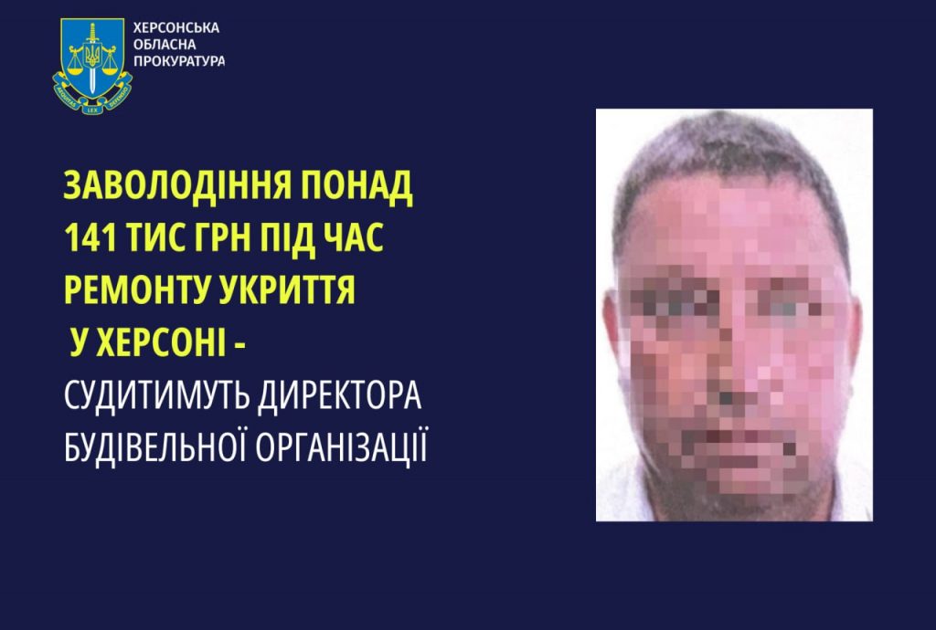 Херсонською окружною прокуратурою затверджено та скеровано до суду обвинувальний акт стосовно директора будівельної організації за фактами заволодіння чужим майном шляхом зловживання службовою особою своїм службовим становищем, вчиненого в умовах воєнного стану, а також службового підроблення (ч. 4 ст. 191, ч. 1 ст. 366 КК України).