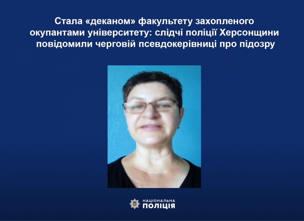 Під час окупації обласного центру працівниця Херсонського державного університету погодилася співпрацювати з представниками країни-агресора. Фігурантка стала «деканом» одного з факультетів захопленого окупантами навчального закладу. Нині їй заочно повідомлено про підозру в колабораційній діяльності. Підозрюваній загрожує три роки ув’язнення.