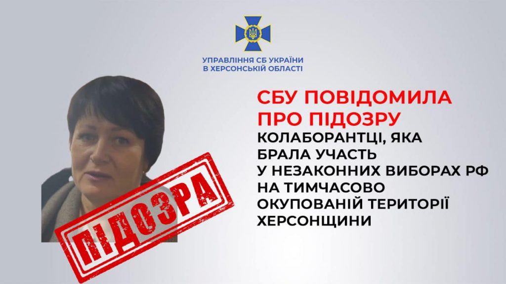 Служба безпеки повідомила про підозру черговій колаборантці з Каховського району, яка взяла участь у незаконних виборах, організованих загарбниками на тимчасово окупованій території Херсонської області.