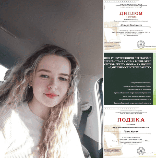 Вікторія представила конкурсну дослідницьку роботу на тему: «Управління конкурентними перевагами підприємства в умовах війни: кейс мультимаркету “Аврора” як модель адаптивної стратегії розвитку».