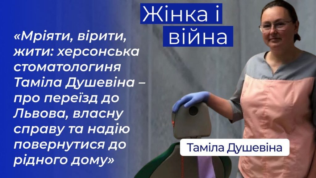 Таміла Душевіна – стоматологиня з Херсонщини, мама трьох дітей, котра наприкінці 2022 року релокувалася з родиною до Львова. Попри труднощі вимушеного переміщення та виклики великого міста лікарка не побоялася відразу відкрити власний кабінет і продовжити улюблену справу.