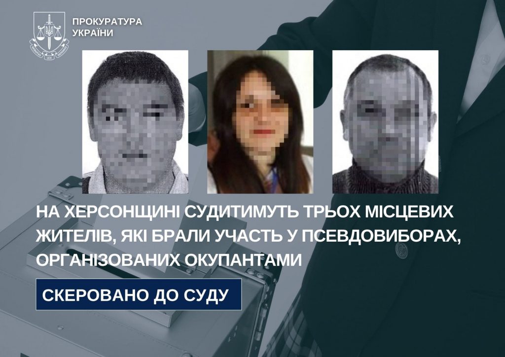 Прокурори Херсонської обласної прокуратури скерували до суду обвинувальні акти стосовно трьох жителів регіону за фактом колабораціонізму (ч. 1, 2 ст. 28, ч. 5 ст. 111-1 КК України).