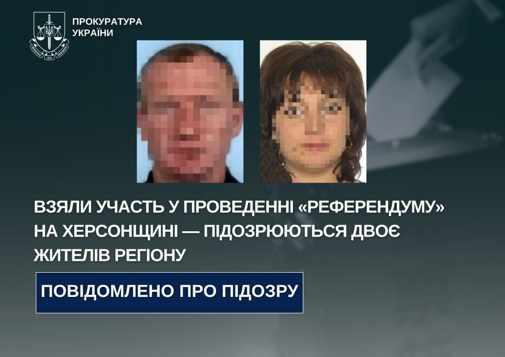За даними слідства, двоє 45-річних підозрюваних восени 2022 року долучилися до так званих «дільничних виборчих комісій», які організовували проведення псевдореферендуму щодо приєднання тимчасово окупованої Херсонщини до складу рф.