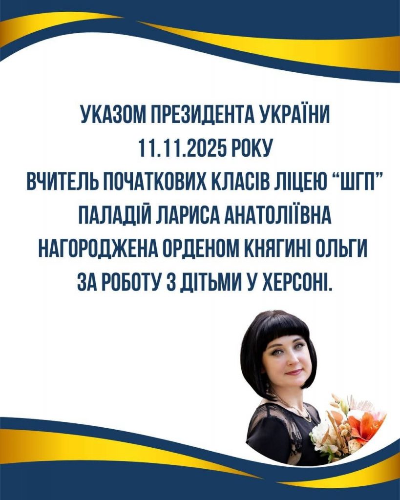 У Херсоні до 3-ї річниці звільнення міста від російських окупантів Президент України вручив державні нагороди. Серед відзначених — учителька початкових класів Ліцею «Школа гуманітарної праці» Херсонської обласної ради Лариса Палладій, яку нагороджено орденом княгині Ольги ІІІ ступеня.