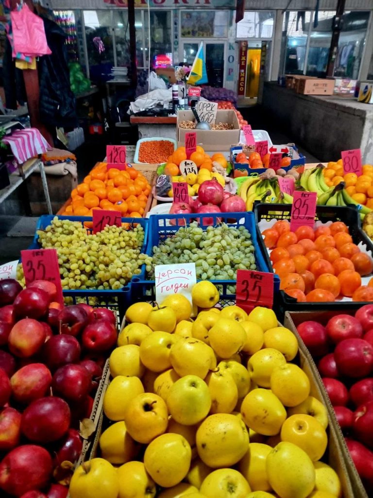 На херсонських ринках зараз можна придбати огірки, помідори, редис, капусту, зелень, яблука, груші та виноград. Також у продажу — буряк, картопля, морква, гарбуз, городина з присадибних ділянок і соління.