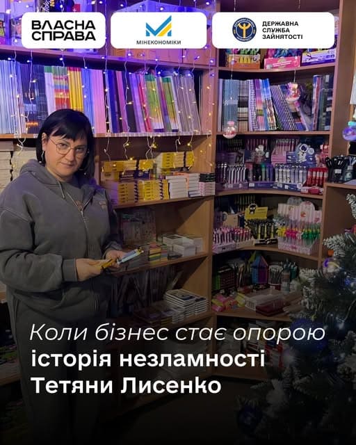 Лисенко Тетяна вже понад 15 років працює у сфері торгівлі канцелярськими товарами та надання комп’ютерних послуг у селищі Велика Олександрівка, що на Бериславщині. Її магазин пережив складні часи й постраждав під час російської окупації, але підприємниця не зупинилася. Вона продовжила працювати для людей, відновила свою справу й наповнила її новим змістом.