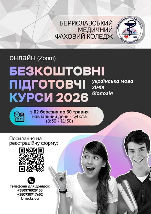 КЗ «Бериславський медичний фаховий коледж» ХОР запрошує абітурієнтів на безкоштовні підготовчі курси з біології, хімії та української мови. Старт курсів заплановано на березень 2026 року.