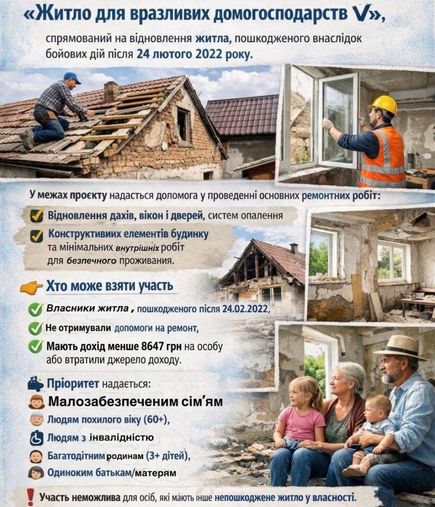Благодійна організація Карітас Берислав УГКЦ спільно з УВКБ ООН реалізує проєкт «Житло для вразливих домогосподарств V». Програма спрямована на підтримку родин, чиє житло було пошкоджене внаслідок бойових дій після 24 лютого 2022 року.