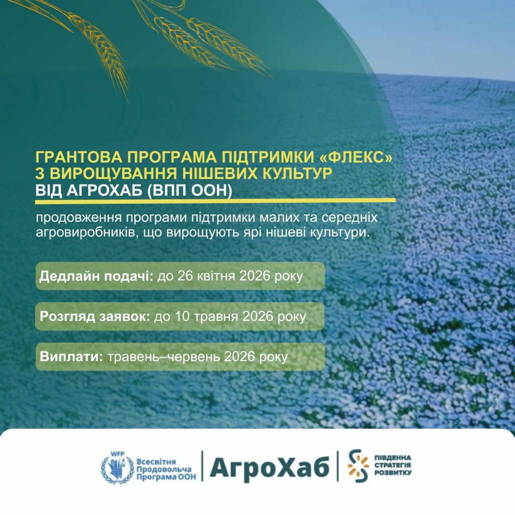 Жителі Херсонської та Миколаївської областей можуть отримати фінансову підтримку на вирощування ярих нішевих культур у 2026 році. Грантова програма «ФЛЕКС» від АгроХабу (ВПП ООН) спільно з ГО «Південна стратегія розвитку» продовжує підтримку малих та середніх агровиробників.