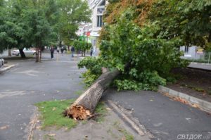 В центре Николаева сильный ветер повалил на тротуар большое дерево
