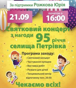 Громадська платформа Юрія Рожкова “Добро переможе” запрошує гостей і жителів Петрівка на святкування поважного ювілею села. Святкова програма пеоедбачає: частування