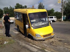 “Сегодня после утреннего дождика дороги начали пожирать маршрутки”, – написал херсонец Стас Синий в facebook и разместил фото, на которых