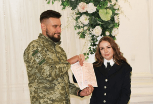 Сьогодні в Херсоні працівники поліції привітали з одруженням свою колегу – сержанта поліції Вікторію Гордієнко. Її обранцем став штаб-сержант Денис