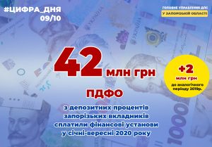 У січні-вересні запорізькі фінансові установи перерахували до державного бюджету 42 мільйони 244 тисячі гривень податку на доходи фізичних осіб із доходу
