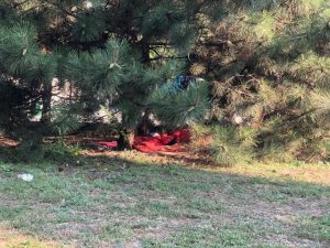 На газоні проспекту Металургів, під пишними соснами поселилися люди без визначеного місця проживання. Безпритульні облаштували там місце для ночівлі та